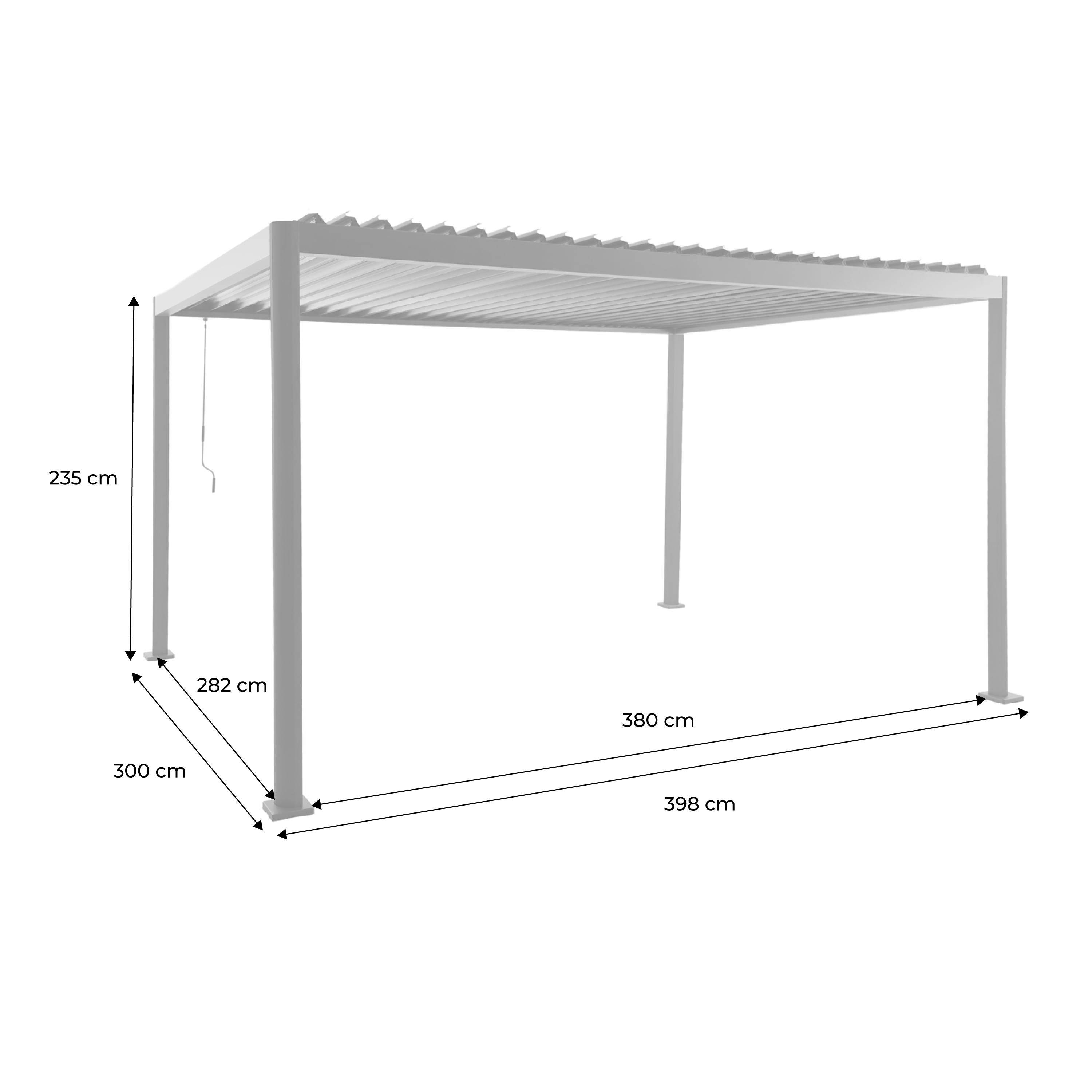 De Imperial 4x3m pergola met verstelbare lamellendak transformeert je tuin in een gezellige ruimte, ongeacht het seizoen. Geen nood om deze in de herfst op te bergen: ze is gemaakt om het hele jaar buiten te blijven. Stevig aan de grond bevestigd, biedt ze schaduw op warme dagen en beschermt ze tegen de regen. Installeer haar boven je tafel, bij het zwembad of om je spa te overdekken en geniet van elk moment buiten.